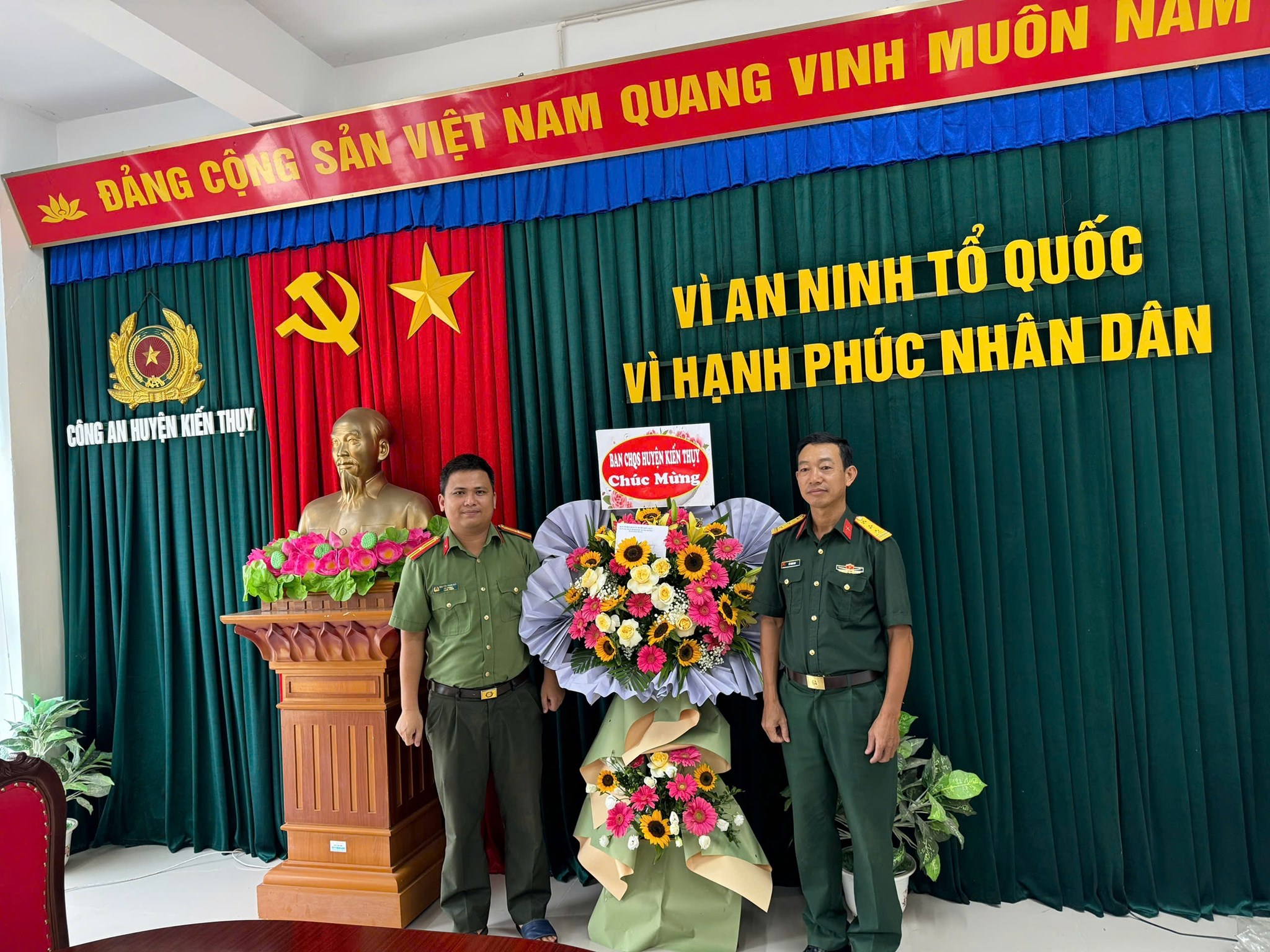 Chiều 16/8, Đoàn cán bộ Ban CHQS huyện Kiến Thụy do đồng chí Thượng tá Đỗ Thành Huy - Phó Chỉ huy trưởng Ban CHQS huyện làm trưởng đoàn đến thăm, tặng hoa chúc mừng cán bộ, chiến sĩ Công an huyện Kiến Thụy nhân kỷ niệm 79 năm Ngày truyền thống lực lượng Công an Nhân dân (19/8/1945 - 19/8/2024).