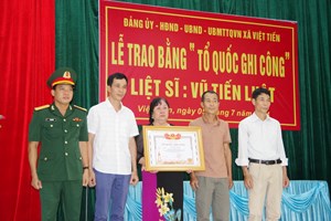 Chiều 05/7, tại UBND xã Việt Tiến, Đảng ủy, HĐND, UBND, UBMTTQ xã đã long trọng tổ chức Lễ Công bố Quyết định và Trao bằng “Tổ quốc ghi công” Liệt sĩ Vũ Tiến Luật. Về dự buổi Lễ có đồng chí Đại tá Vũ...