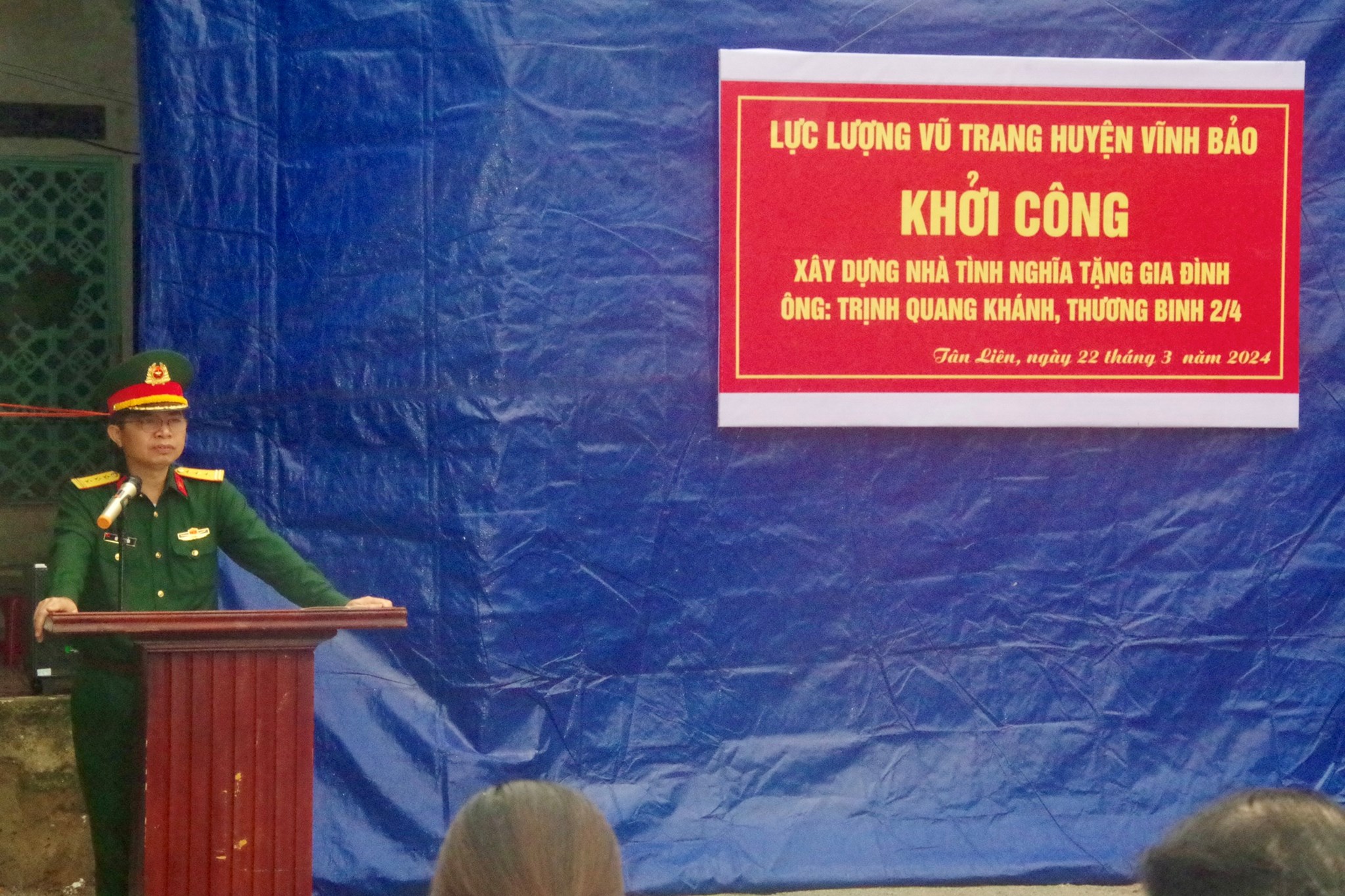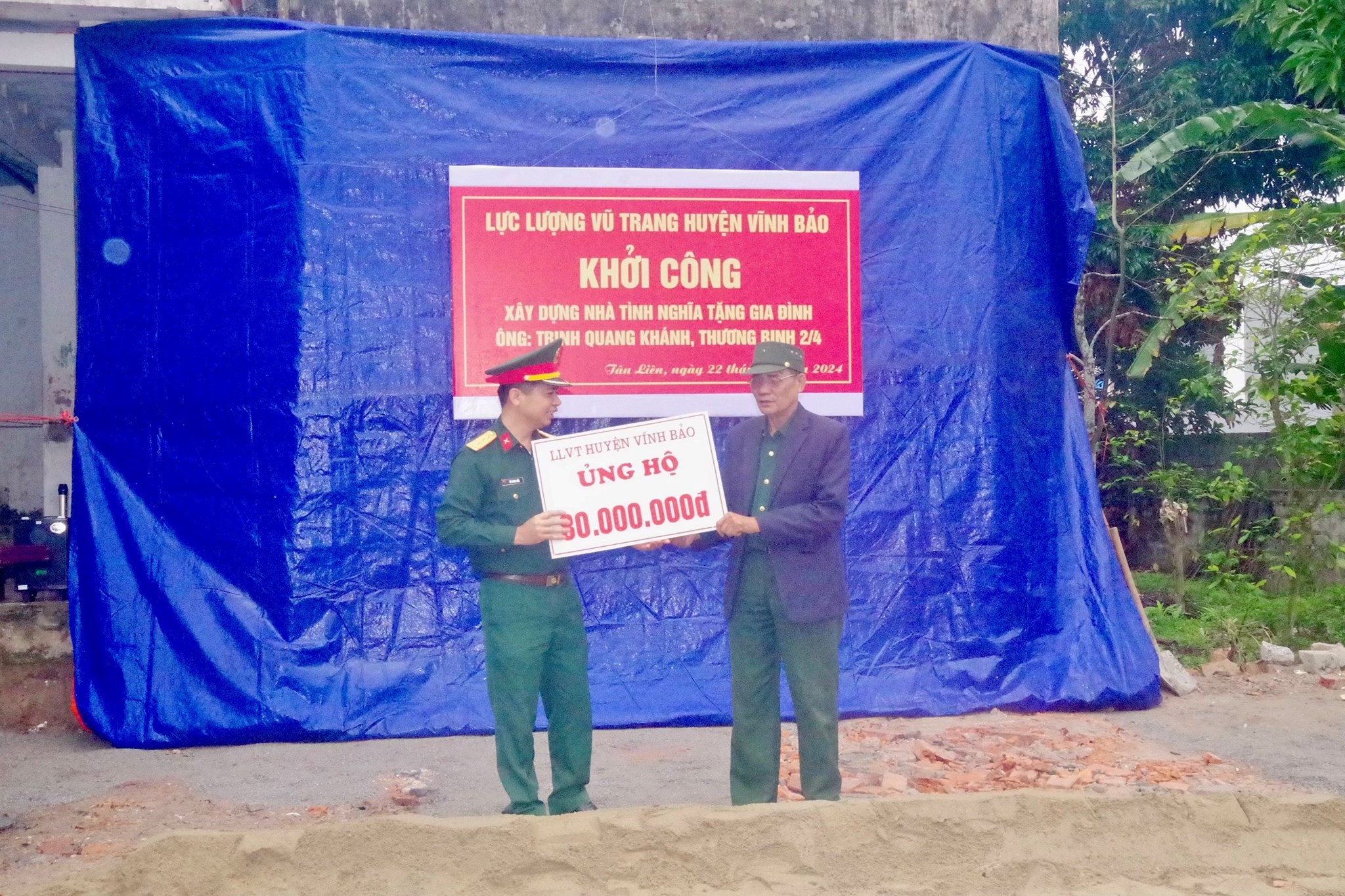 Sáng 22/3, Ban CHQS huyện Vĩnh Bảo phối hợp với cấp ủy, chính quyền xã Tân Liên tổ chức khởi công xây dựng nhà tình nghĩa tặng gia đình ông Trịnh Quang Khánh - Thôn Nội Đơn, xã Tân Liên, huyện Vĩnh Bảo, thành phố Hải Phòng, hướng tới kỷ niệm 49 năm ngày Giải phóng Miền Nam thống nhất đất nước (30/4/1975-30/4/2024), kỷ niệm 70 năm chiến thắng Điện Biên Phủ.
