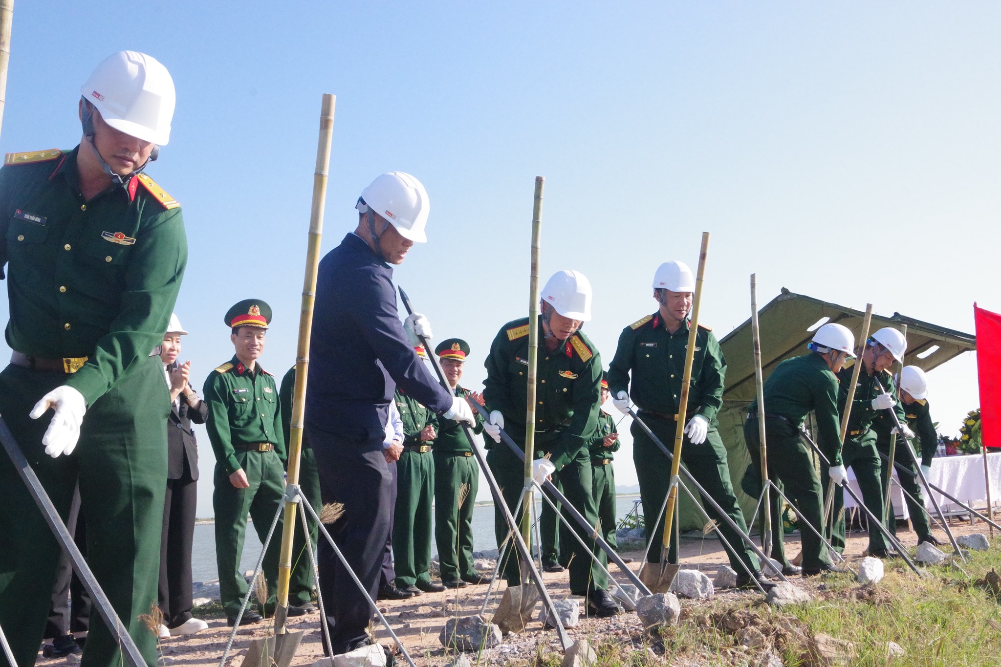 Các đồng chí lãnh đạo Bộ CHQS TP cùng các đơn vị chủ đầu tư xây dựng tổ chức động thổ xây dựng doanh trại và khu neo đậu tàu thuyền Hải đội Dân quân thường trực