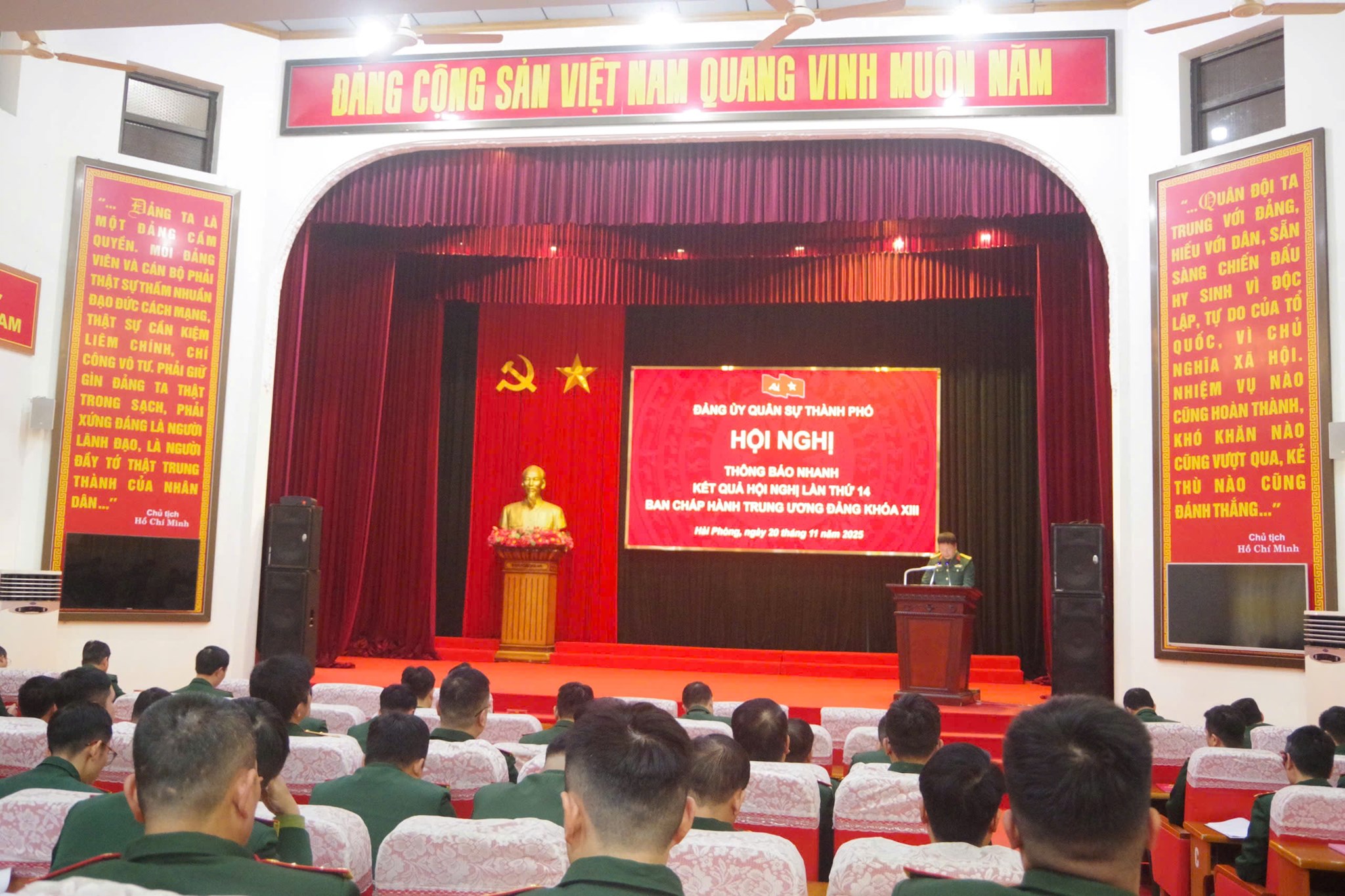 Chiều 20/11, Đảng ủy Quân sự thành phố Hải Phòng tổ chức hội nghị thông báo nhanh kết quả Hội nghị lần thứ 14 Ban Chấp hành Trung ương Đảng khóa XIII. Đại tá Đặng Văn Hòa - Thành ủy viên, Phó bí thư Thường trực Đảng ủy, Chính ủy Bộ CHQS thành phố chủ trì hội nghị.