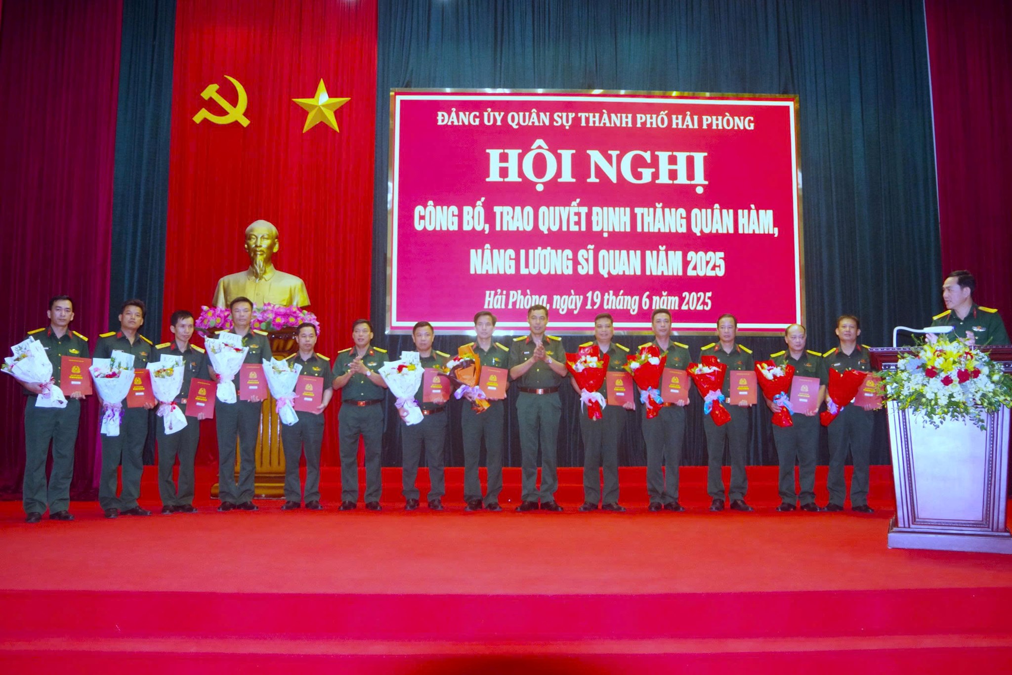 Chiều 19/6, Đảng ủy Quân sự thành phố Hải Phòng tổ chức Hội nghị công bố, trao quyết định thăng quân hàm, nâng lương sĩ quan 2025. Đồng chí Đại tá Bùi Xuân Thắng, Ủy viên Ban Thường vụ Thành ủy, Phó Bí thư Đảng ủy Quân sự, Chỉ huy trưởng Bộ CHQS thành phố dự và chủ trì hội nghị. Cùng dự có các đồng chí trong Đảng ủy, Thủ trưởng Bộ chỉ huy Quân sự thành phố; các đồng chí chỉ huy các cơ quan, đơn vị cùng các đồng chí nhận quyết định đợt này.