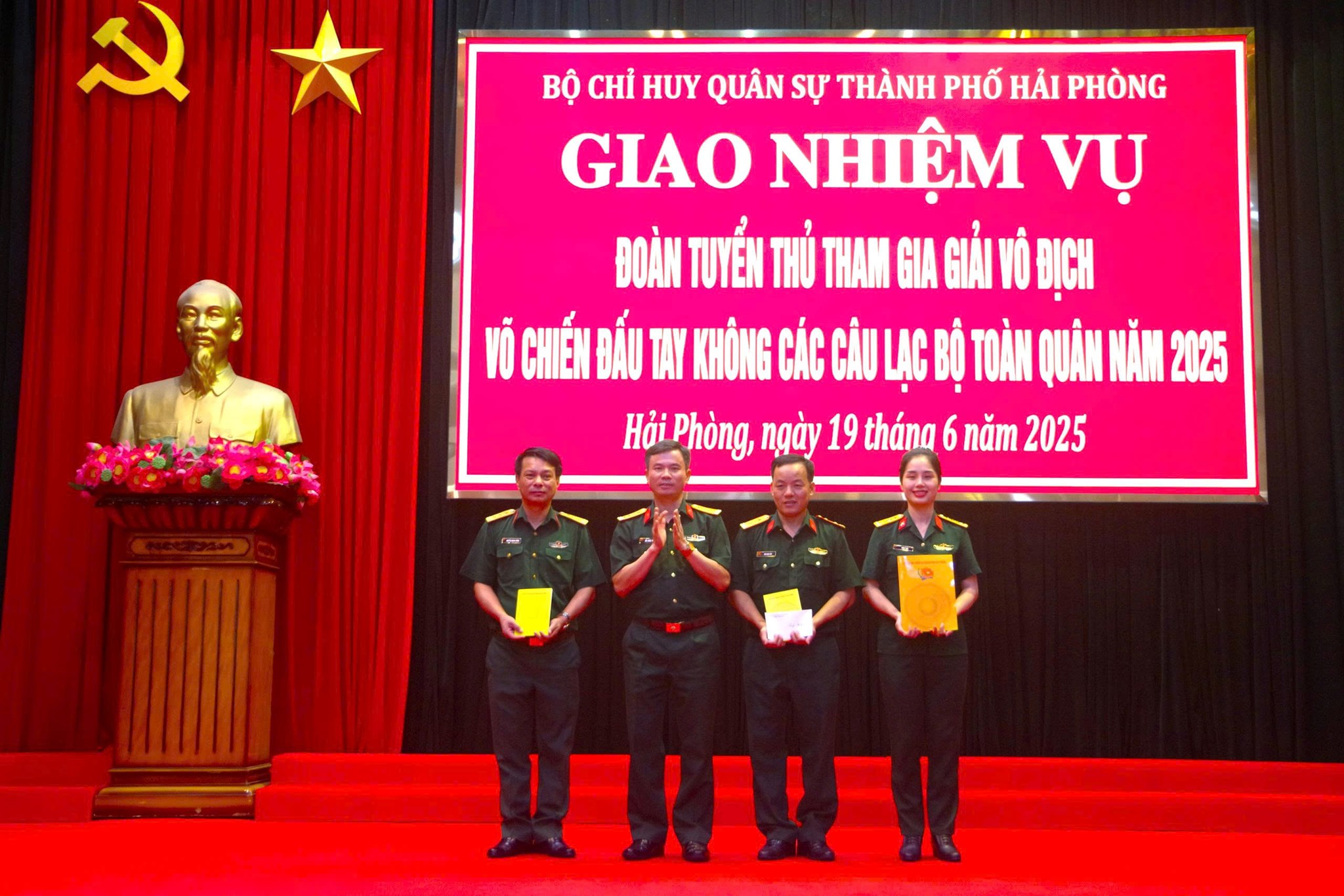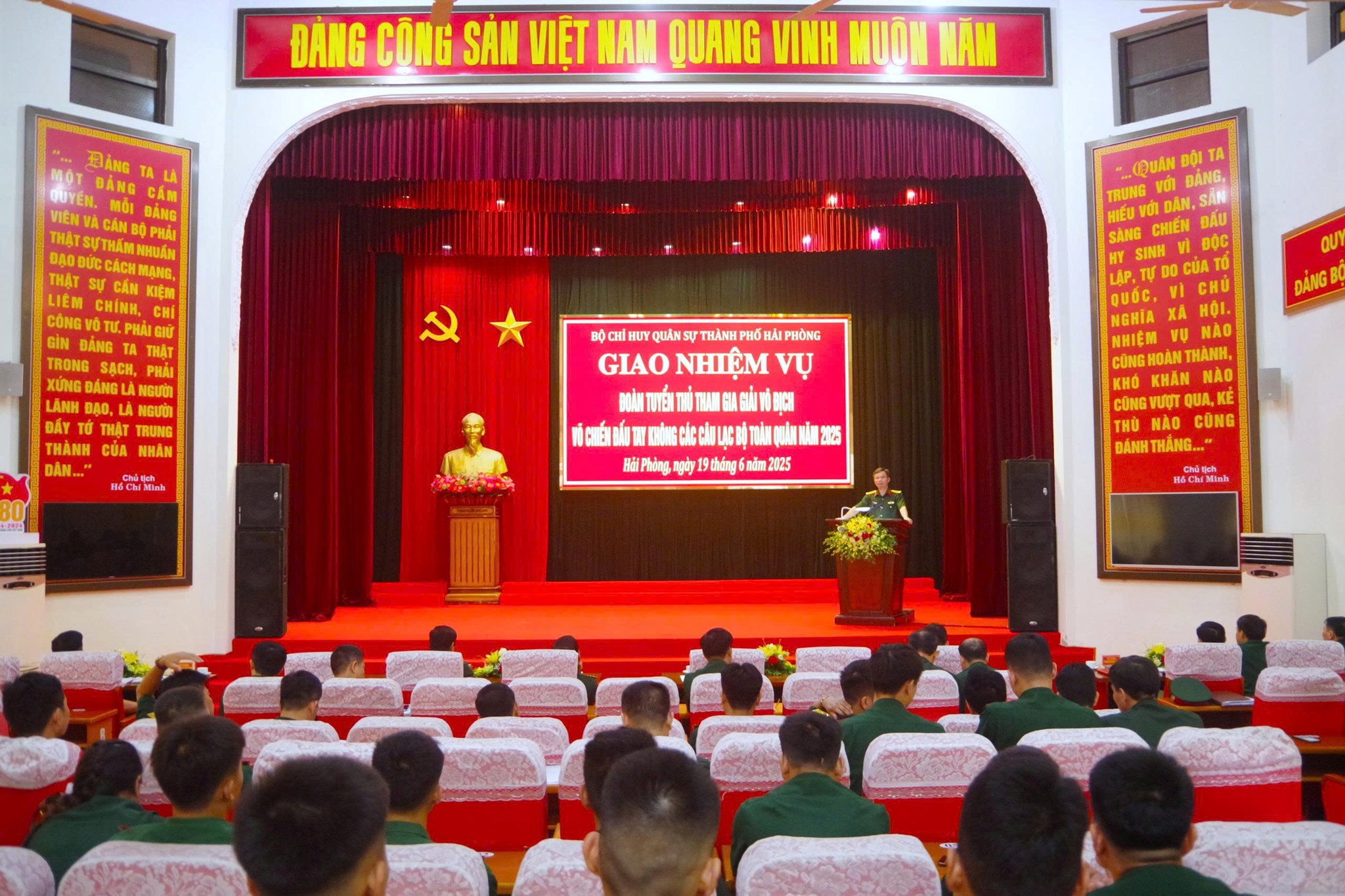 Chiều 19/6, Bộ CHQS thành phố Hải Phòng đã tổ chức Hội nghị giao nhiệm vụ cho Đoàn tuyển thủ tham gia giải vô địch võ chiến đấu tay không các câu lạc bộ toàn quân năm 2025. Đồng chí Đại tá Bùi Xuân Thắng, Uỷ viên Ban Thường vụ Thành ủy, Chỉ huy trưởng Bộ CHQS thành phố chủ trì hội nghị. Cùng dự có các đồng chí trong Đảng ủy, Thủ trưởng Bộ CHQS thành phố, chỉ huy các Phòng, Ban cơ quan Bộ chỉ huy.