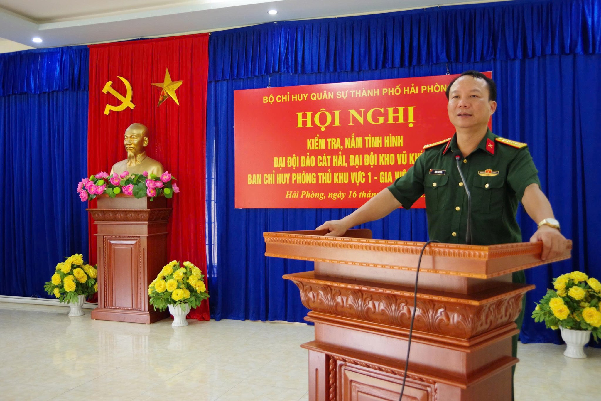 Cùng ngày, Đoàn công tác số 2 do đồng chí Đại tá Đặng Văn Hòa, Phó Bí thư Thường trực Đảng ủy, Chính ủy Bộ CHQS thành phố làm trưởng đoàn kiểm tra tại Đại đội đảo Cát Hải và Đại đội kho Vũ khí đạn (Ban Chỉ huy PTKV 1 - Gia Viên). Sau khi nghe chỉ huy đơn vị báo cáo kết quả thực hiện nhiệm vụ thời gian qua, đoàn đã trực tiếp kiểm tra công tác sẵn sàng chiến đấu, huấn luyện, xây dựng chính quy, rèn luyện kỷ luật và đời sống vật chất, tinh thần của bộ đội. Đồng chí Chính ủy Bộ CHQS thành phố ghi nhận những nỗ lực, cố gắng của cán bộ, chiến sĩ Đại đội đảo Cát Hải, Đại đội kho Vũ khí đạn trong khắc phục khó khăn về điều kiện thời tiết, địa bàn công tác xa trung tâm, vẫn duy trì nghiêm chế độ trực, huấn luyện, sẵn sàng cơ động khi có tình huống. Đồng chí nhấn mạnh: Đảng ủy, chỉ huy đơn vị cần tiếp tục quan tâm làm tốt công tác tư tưởng, nắm chắc tình hình, kịp thời động viên cán bộ, chiến sĩ; phát huy tinh thần đoàn kết, khắc phục khó khăn, hoàn thành tốt nhiệm vụ được giao. Đoàn công tác cũng đã lắng nghe, trao đổi trực tiếp với cán bộ, chiến sĩ về những tâm tư, nguyện vọng, nhất là liên quan đến chế độ, chính sách, công tác hậu phương quân đội, điều kiện ăn ở, sinh hoạt…