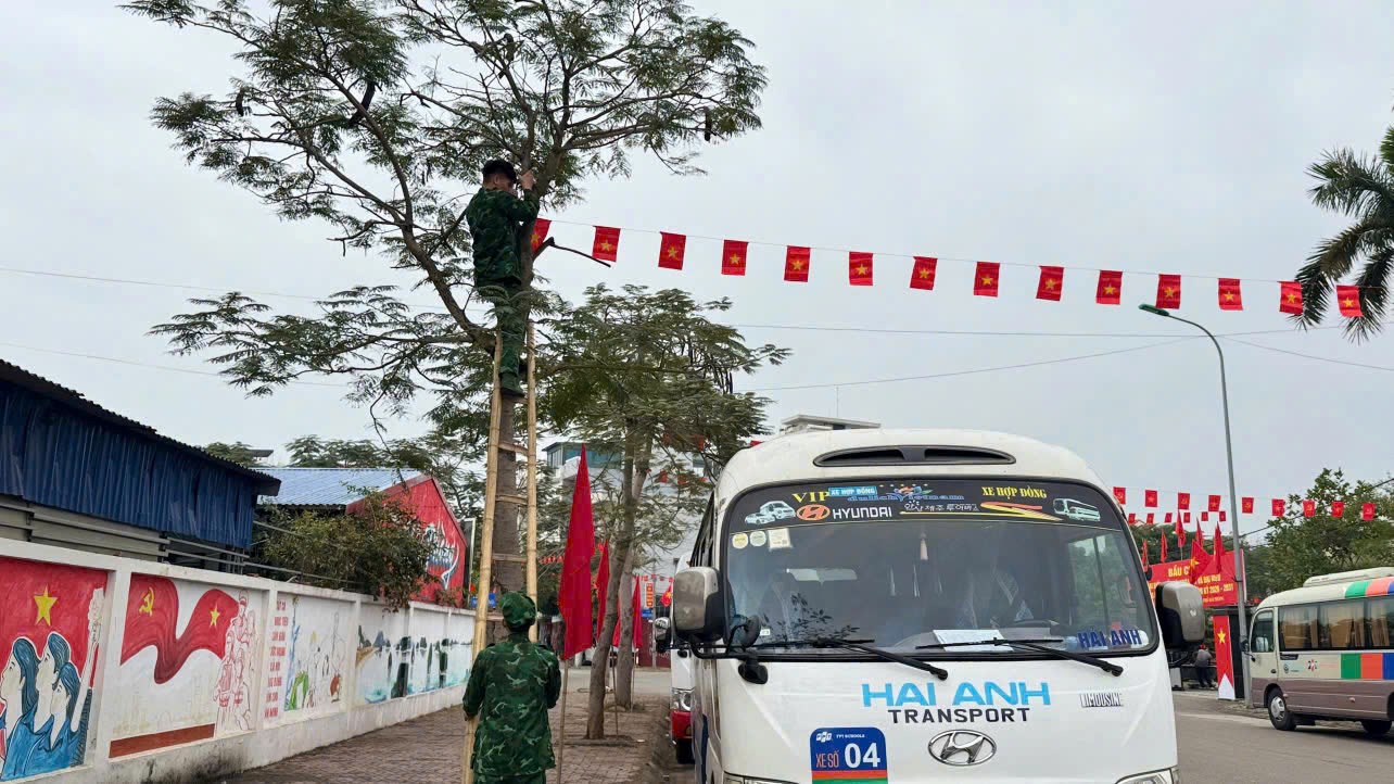 Cán bộ, chiến sĩ Đồn Biên phòng Tràng Cát tích cực tham gia trang trí tại các điểm bầu cử