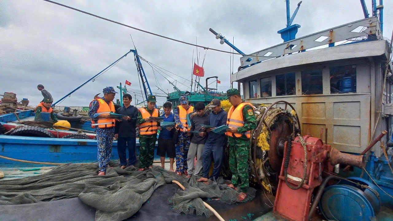Cán bộ, chiến sĩ Đồn Biên phòng Tràng Cát xuống từng phương tiện để tuyên truyền, vận động ngư dân tham gia bầu cử