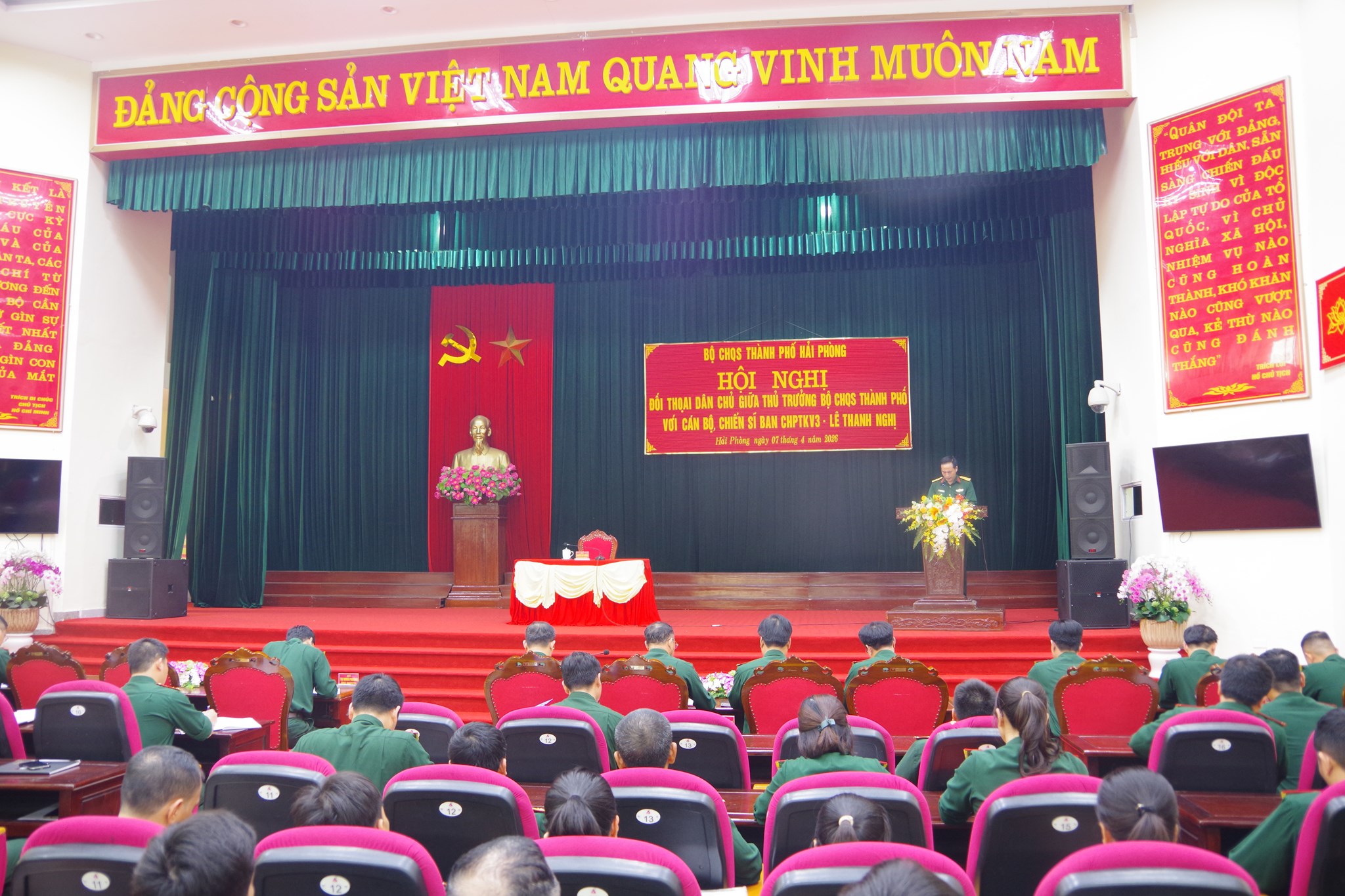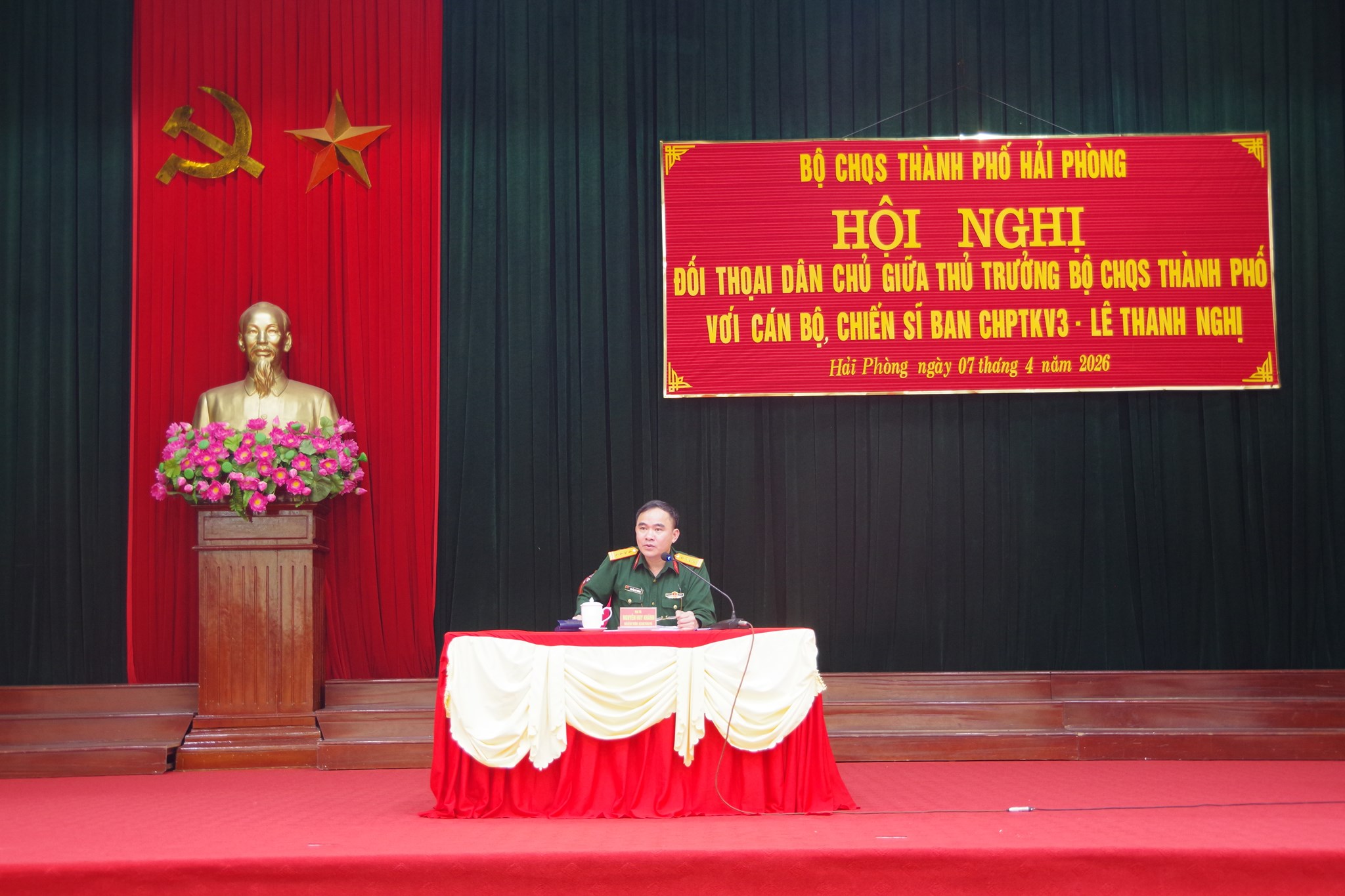 Chiều 07/4, Đại tá Nguyễn Huy Khánh, Phó Chỉ huy trưởng Bộ CHQS thành phố Hải Phòng đã chủ trì hội nghị đối thoại dân chủ với cán bộ, chiến sĩ Ban Chỉ huy PTKV3 - Lê Thanh Nghị; các đơn vị trực thuộc Bộ CHQS thành phố và đại diện Ban CHQS 30 xã, phường trên địa bàn. Cùng dự buổi đối thoại có chỉ huy các cơ quan chức năng Bộ CHQS thành phố.