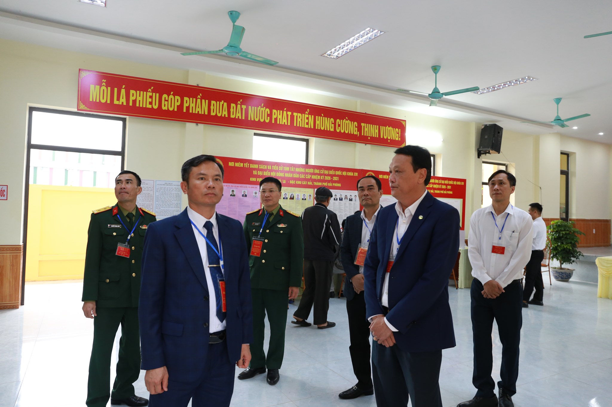 Sau khi thực hiện quyền công dân, đồng chí Chỉ huy trưởng kiểm tra công tác tổ chức bầu cử tại Khu vực bỏ phiếu số 16 thôn Phong Liên thuộc Đặc khu Cát Hải, Khu vực bỏ phiếu số 3 tại thôn Đông xã Nguyễn Lương Bằng và Khu vực bỏ phiếu số 12 thôn An Sơn thuộc xã Bắc Thanh Miện.