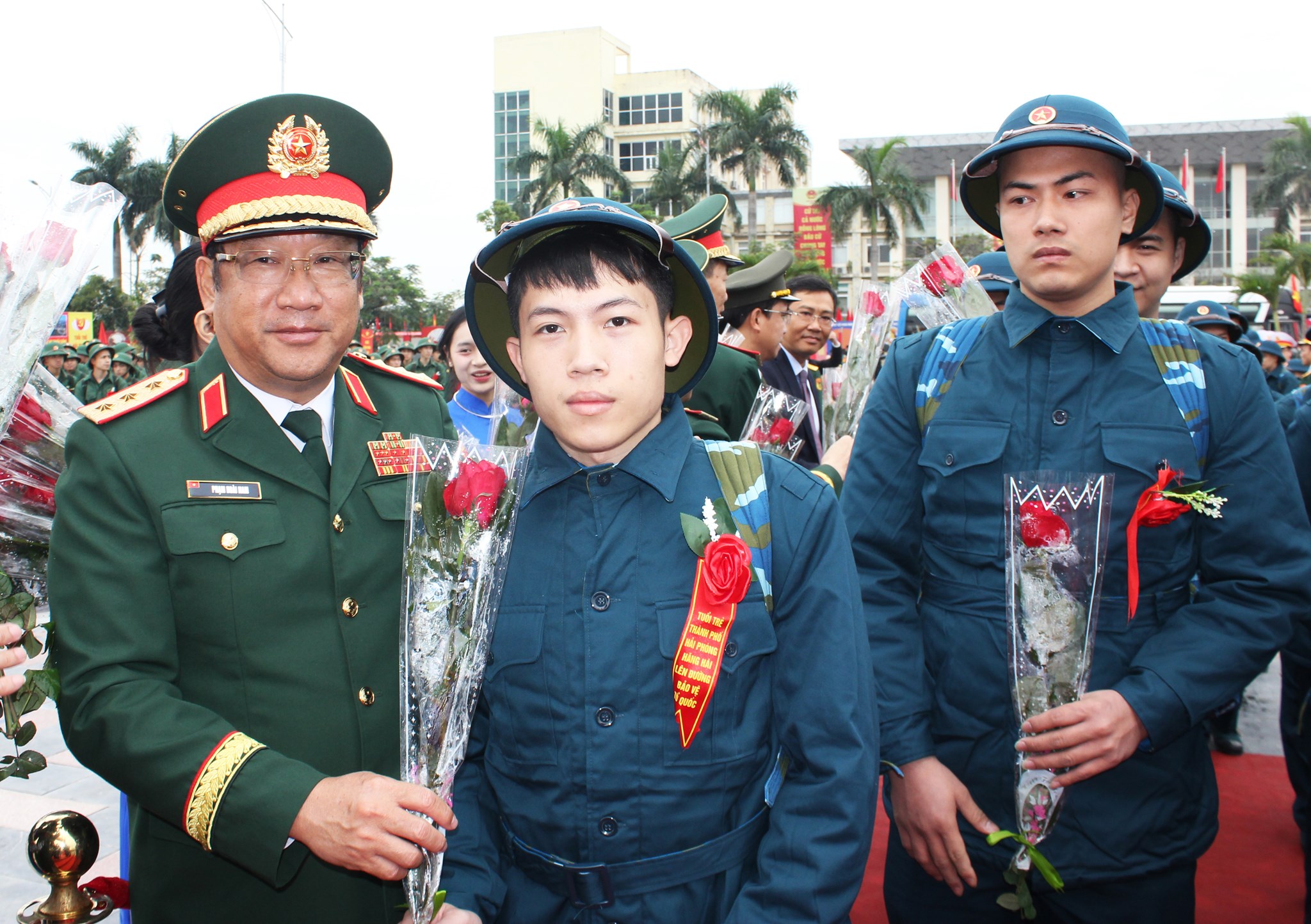 Thượng tướng Phạm Hoài Nam, Ủy viên Ban Chấp hành Trung ương Đảng, Ủy viên Quân ủy Trung ương, Thứ trưởng Bộ Quốc phòng tặng hoa thanh niên trước khi lên đường nhập ngũ