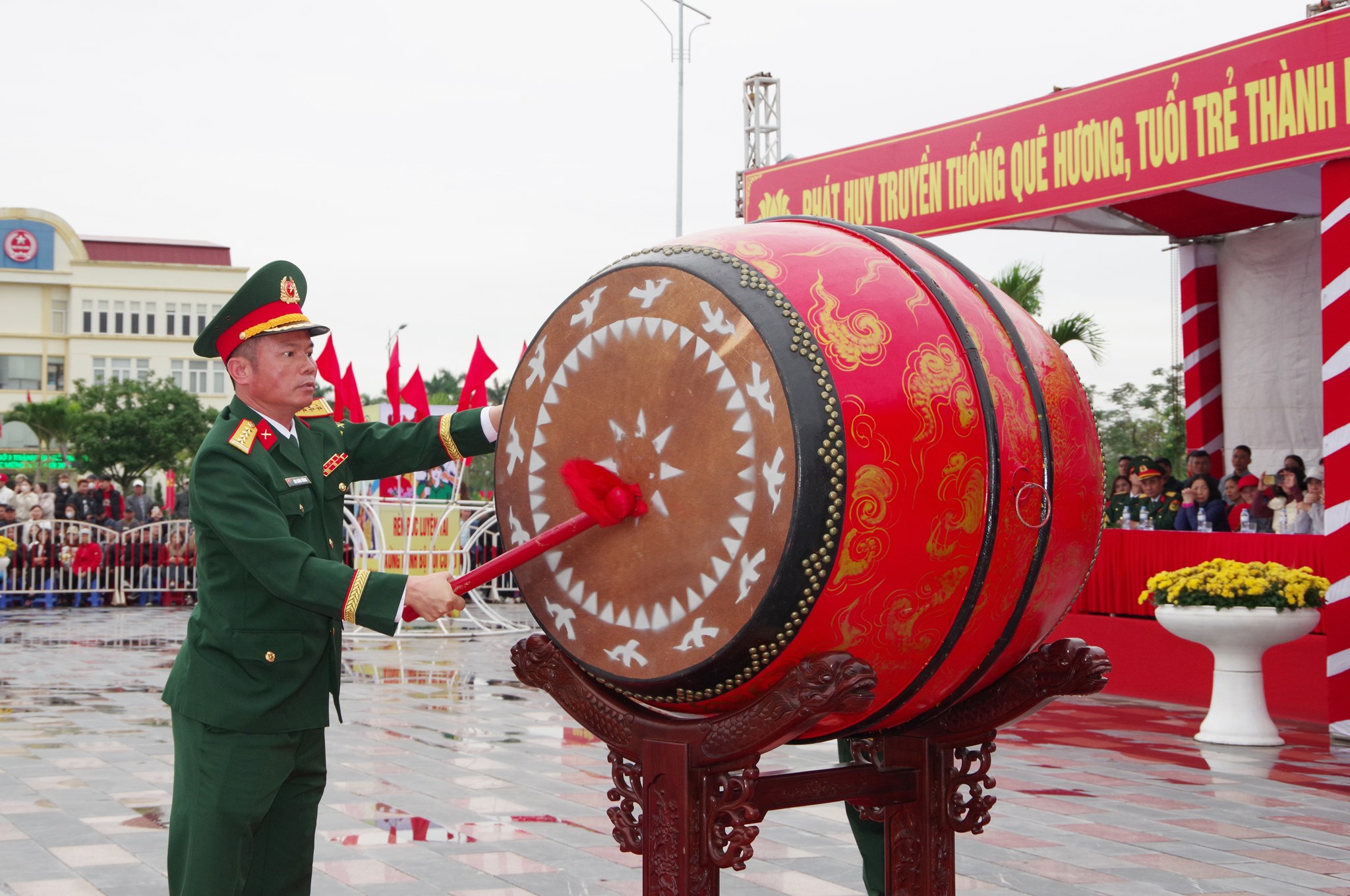 Đồng chí Chỉ huy trưởng Bộ CHQS TP Hải Phòng đánh trống hội tòng quân