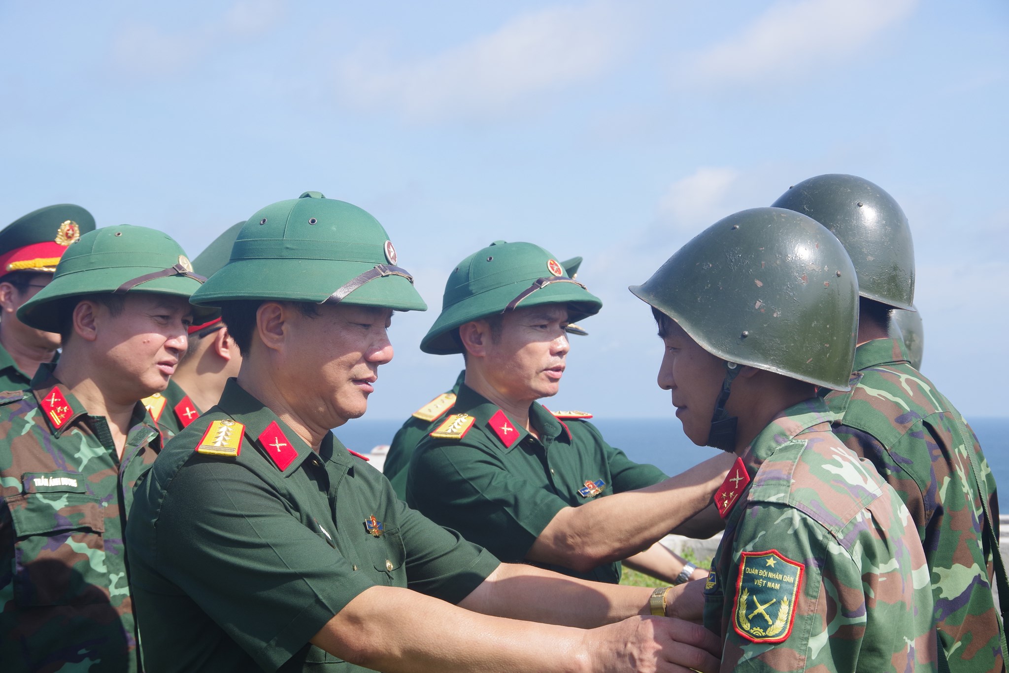 Đại tá Bùi Xuân Thắng - Uỷ viên Ban Thường vụ Thành uỷ, Chỉ huy trưởng và Đại tá Đặng Văn Hoà - Thành uỷ viên, Phó Bí thư thường trực Đảng uỷ, Chính uỷ Bộ CHQS thành phố động viên cán bộ, chiến sĩ Tiểu đoàn Phòng Thủ đảo Bạch Long Vĩ trực SSCĐ tại trận địa