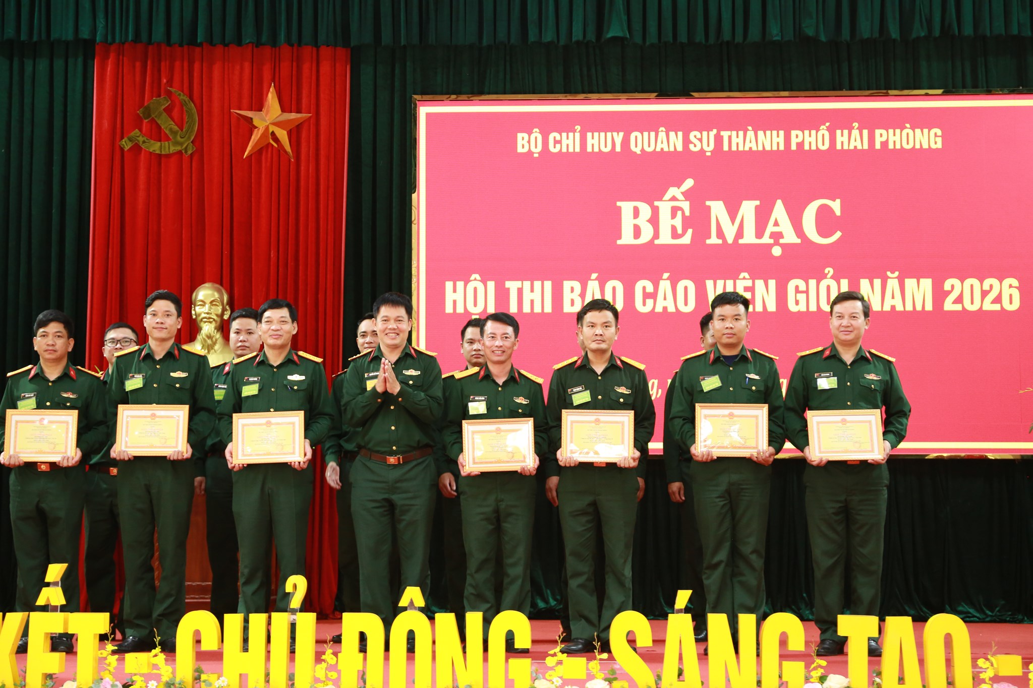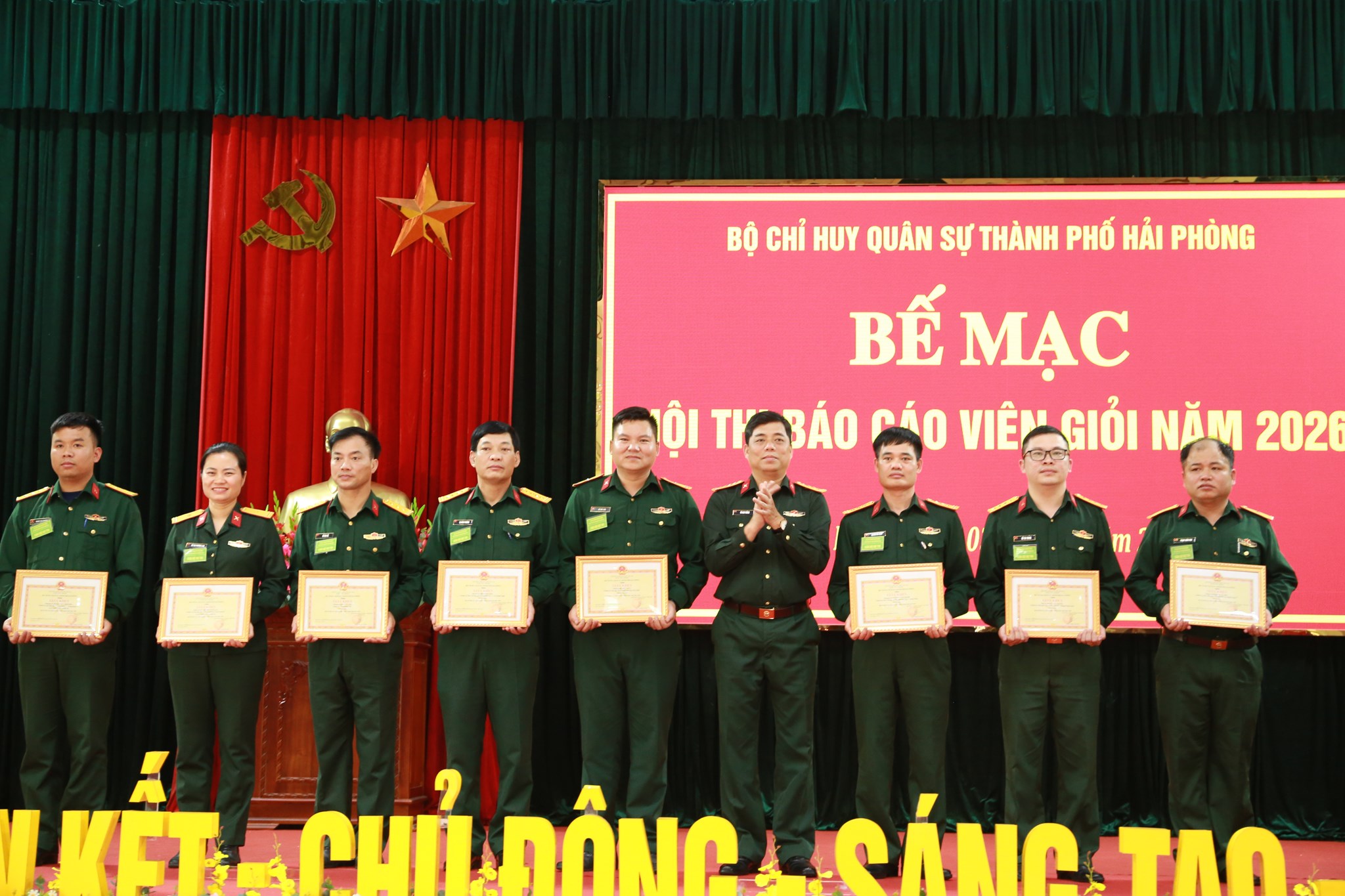 Kết thúc hội thi, Thủ trưởng Bộ CHQS thành phố đã tặng Giấy khen cho 8 cá nhân đạt thành tích xuất sắc trong hội thi (1 giải Nhất, 2 giải Nhì, 3 giải Ba, 2 giải Khuyến khích) đồng thời trao 21 Giấy chứng nhận cho cán bộ đạt danh hiệu Báo cáo viên giỏi cấp Bộ CHQS thành phố năm 2026.