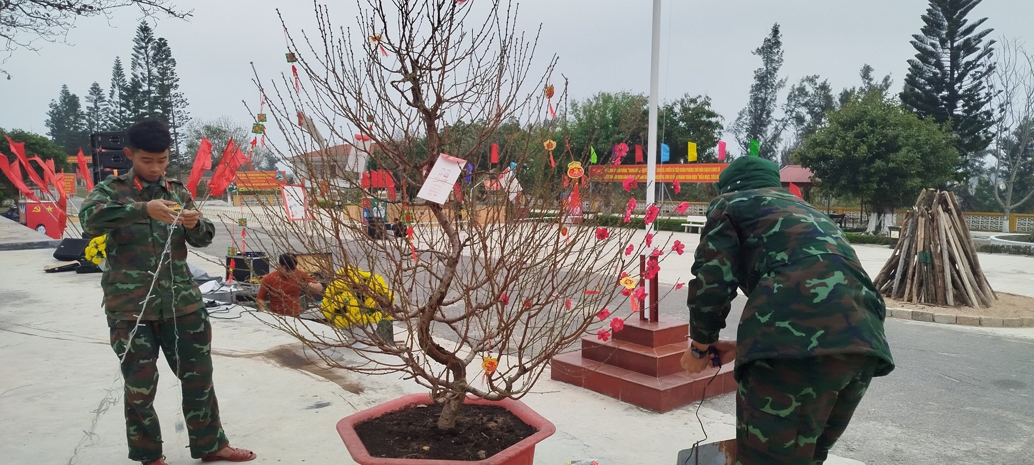 Các chiến sĩ trang hoàng cây đào đón Tết